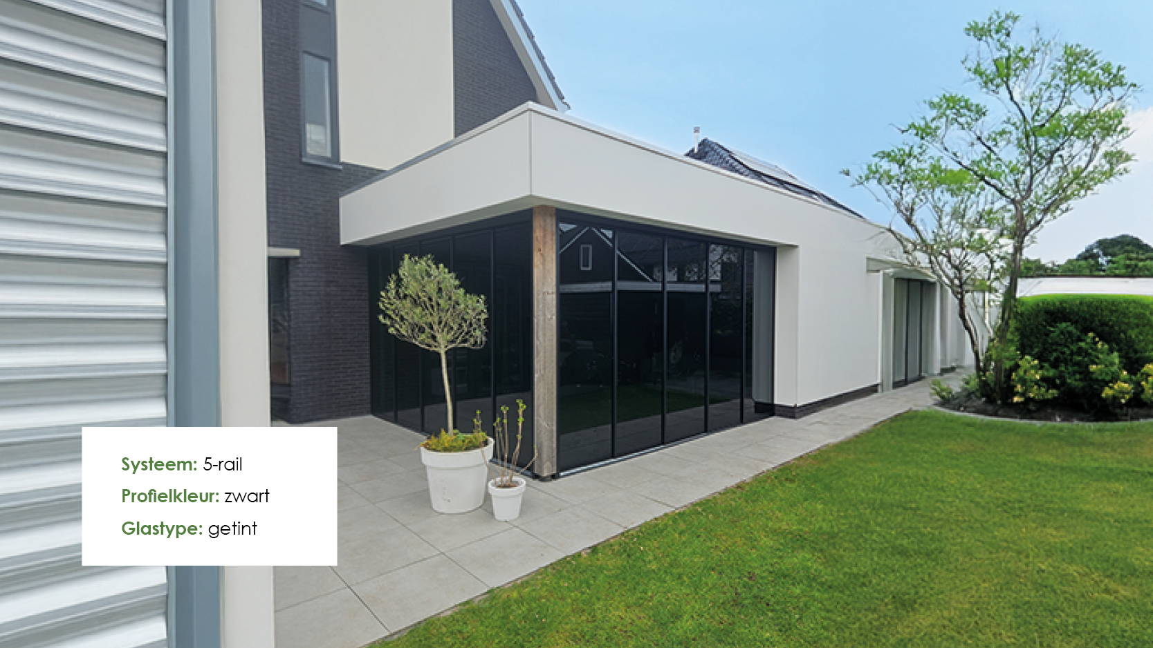 Alles klopt tot in detail: zowel de profielen als de accessoires zijn volledig uitgevoerd in het zwart of antraciet, wat zorgt voor een stijlvol en strak geheel. Bekijk hier alle glazen schuifwanden.