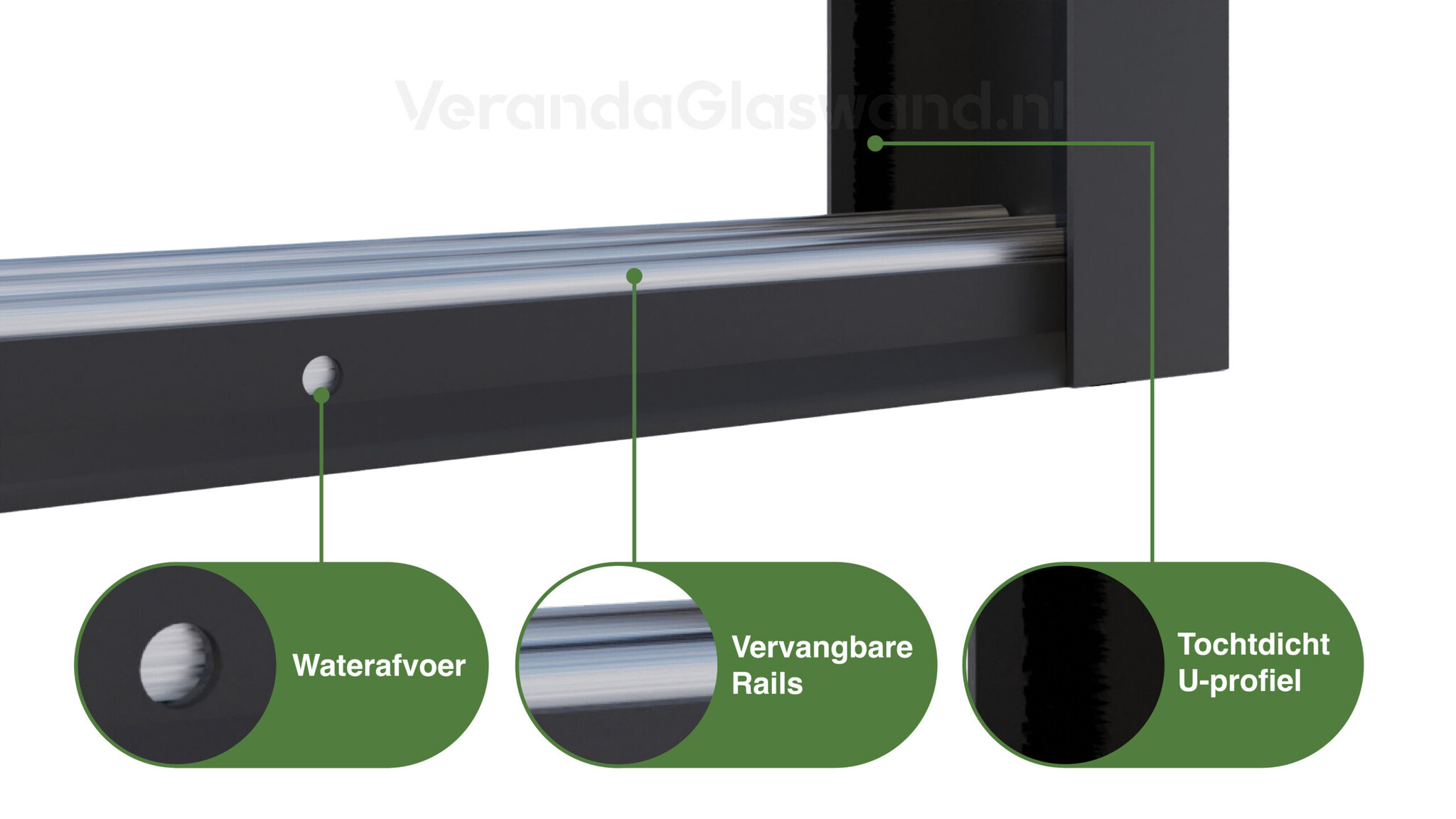 Uniek aan het onderprofiel is het verwisselbare loopspoor met geïntegreerde waterafvoer. Het onderprofiel bestaat uit 2 delen en is in kleur gecoat. Dit zorgt voor een een luxe uitstraling. Het loopspoor is vervangbaar bij schade. Groot voordeel hiervan is dat alleen het loopspoor vervangen dient te worden bij schade, in plaats van de volledige rails. Hoogte van het onderprofiel is 20mm. De breedte is 60mm