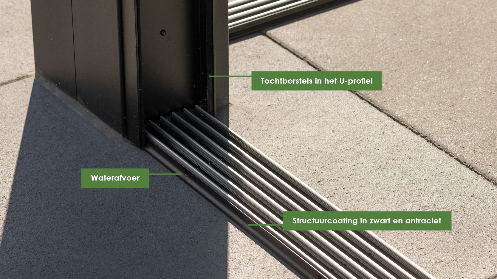 - Uniek onderprofiel met een vervangbaar loopspoor, geïntegreerde waterafvoer en verkrijgbaar in antraciet en zwart