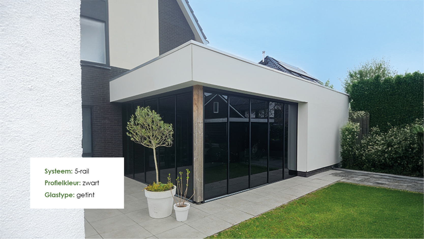 Alles klopt tot in detail: zowel de profielen als de accessoires zijn volledig uitgevoerd in het zwart of antraciet, wat zorgt voor een stijlvol en strak geheel. Bekijk hier alle glazen schuifwanden.