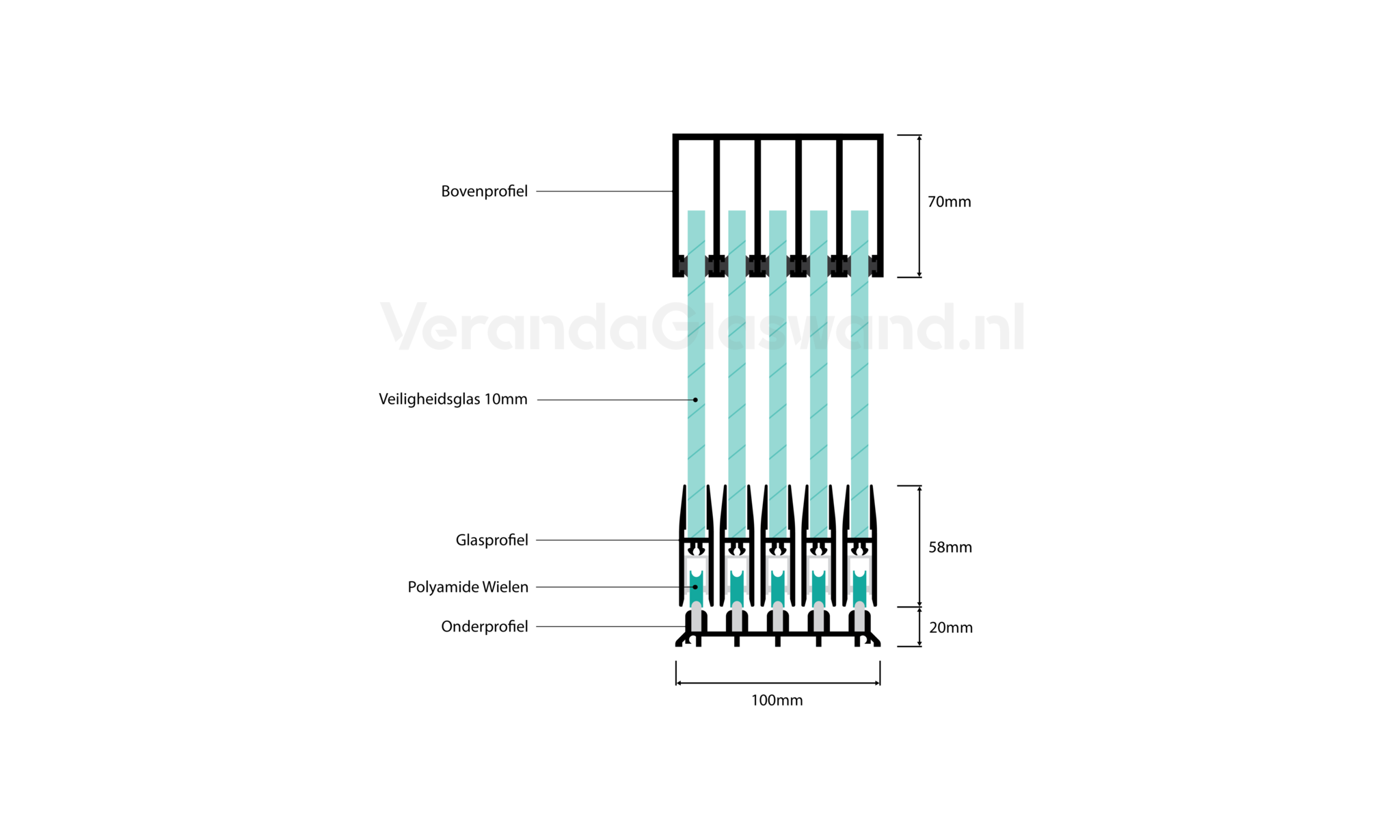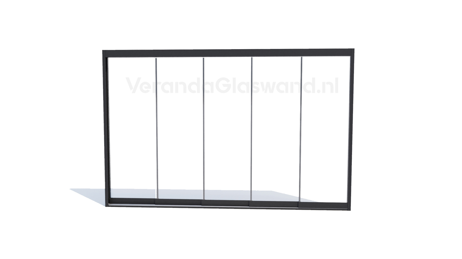 Een glazen schuifwand met 5 glaspanelen van 103cm sluit een opening af tot 503cm. Bij deze breedte overlappen de glaspanelen 3cm. Is de opening kleiner dan 503cm, dan is dat geen probleem. De overlap wordt dan wat groter Bij een te grote overlap kan het zijn dat dat smallere panelen of het gebruik van minder glaspanelen betere opties zijn