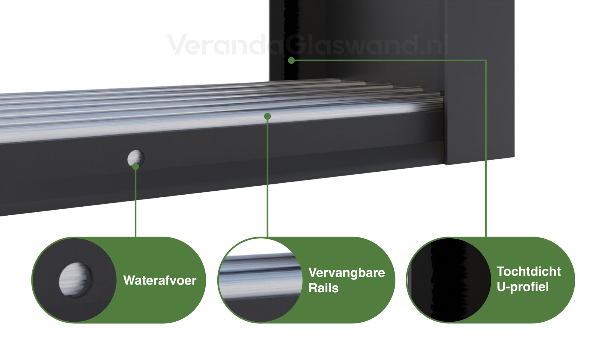 Uniek aan het onderprofiel is het verwisselbare loopspoor met geïntegreerde waterafvoer. Het onderprofiel bestaat uit 2 delen en is in kleur gecoat. Dit zorgt voor een een luxe uitstraling. Het loopspoor is vervangbaar bij schade. Groot voordeel hiervan is dat alleen het loopspoor vervangen dient te worden bij schade, in plaats van de volledige rails. Hoogte van het onderprofiel is 20mm. De breedte is 100mm