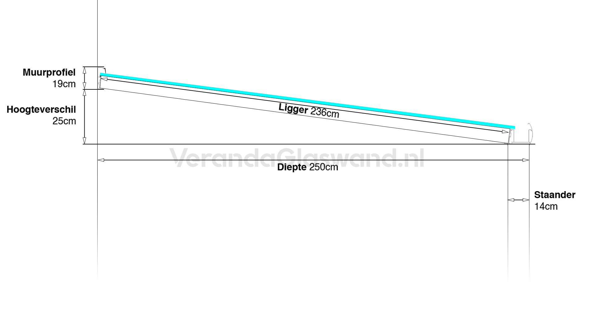Moderne aluminium overkapping 2,5 meter diep en tot 5,07 meter breed met een helder polycarbonaat dak. Geniet van het buitenleven en uw tuin met deze aluminium veranda.. Deze veranda wordt exact op maat geleverd of door ons gemonteerd. Deze veranda wordt op de maatvoering geleverd zoals aangegeven in de afmetingen. Dit zijn de afmetingen van buitenkant van de aluminium staanders gemeten uit de gevel van het huis.